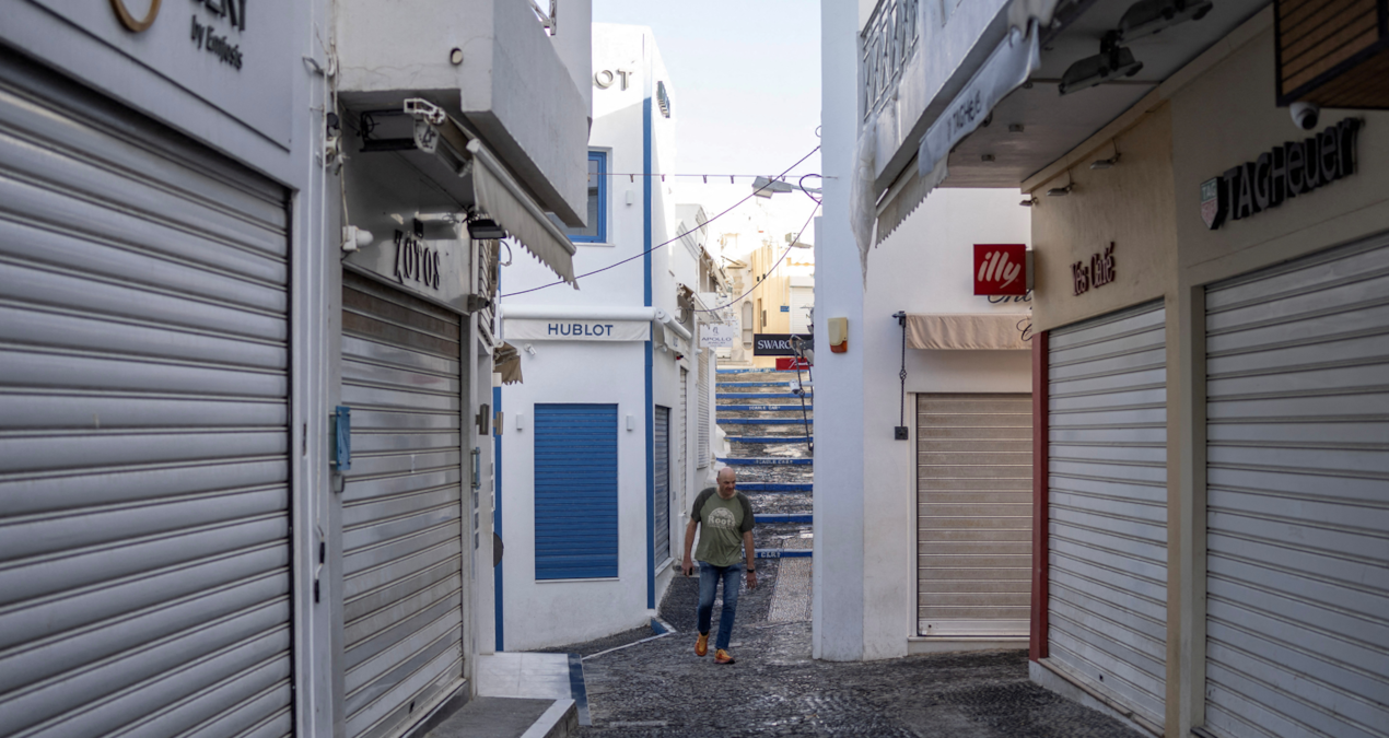Turist akınlarıyla ünlü olan Santorini, şimdi sessizliğe bürünmüş durumda. Şehrin beyaz yapılarının arasındaki ses, rüzgar uğultusu ve hala adayı terk etmeyi reddeden birkaç kişinin günlük hayatından ibaret.